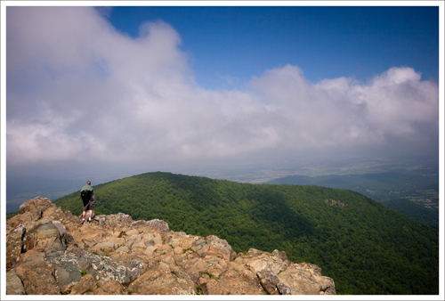 We really had one of those almost perfect days in Shenandoah National Park. We made it up to the park before 7AM. There was a lot of fog on the mountains that made for tough visibility, so we decided to grab breakfast at Skyland Resort before setting out on our hike. While we were eating breakfast, our waitress pointed out a black bear right outside the dining room window. It stayed out there for several minutes while people photographed it (they got really close – within 10-15 feet of the bear). While Christine made an attempt to grab her camera from the car for her own photo opportunity (which she missed), I noticed the AT thru-hiker we met on the Loft Mountain Loop had just sat down to dive into a hearty breakfast. I talked to him about how we were thinking about him braving the thunderstorms the last few days. He said that the Tuesday night storms had indeed been brutal.