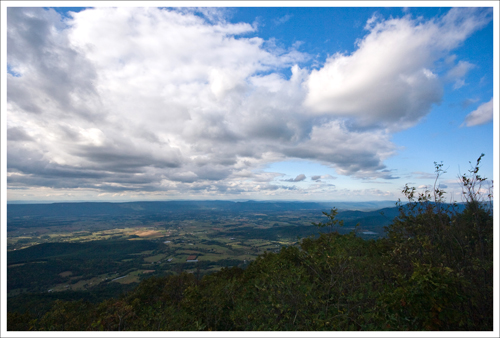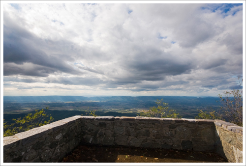 Once you start the hike, you will go up a short distance until you reach a building that I think was either a radio tower or weather station. Shortly after that at .2 miles, you will come to a cement post. Heading straight ahead for a few feet will lead you to the Brushytop overlook. From here, you will get nice views of farmlands and small communities in the Shenandoah Valley. Backtrack to the post and head down. You will pass by a few boulder falls along the side. There are a few views off to both sides of the trail along the way before you reach the observation outpost at .8 miles. We had some overhanging clouds from the storm front that was slowly moving through, but we still were able to get gorgeous 180 degree views to the east. We were also fortunate enough to see a peregrine falcon swoop by, reminding us of our Hawksbill Summit Loop hike.