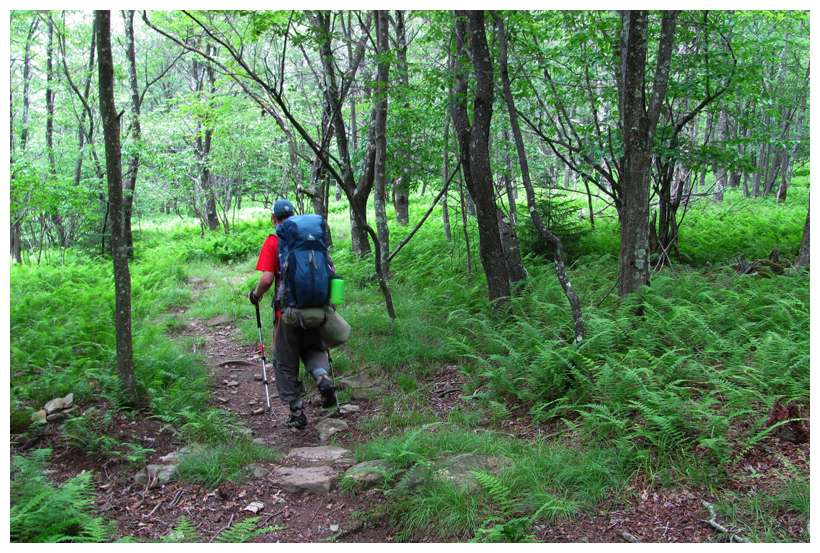 We found space to shove the sandwiches into Suzanne’s pack, slathered ourselves with sunscreen and bug spray, and got to the business of walking.  Almost immediately after stepping off the dusty, gravel forest road onto the trail, we found ourselves ensconced in a cool, lush, green forest.  Ferns spread across the ground for as far as the eye could see.  The trail descended gradually, occasionally crossing small, mostly dry streams.  The trail got rockier as we followed it for a little over a mile to its junction with the Rohrbaugh Plains trail.  We stopped at the trail junction and ate our lunch.  We chatted with a passing backpacker who was doing a 19-mile loop through Dolly Sods.  She was on a solo trip and told us she was headed down into the Red Creek basin.  We asked her if she had noticed many camps set up near the cliffs.  She said she hadn’t seen anyone, so we took that as a hopeful sign.