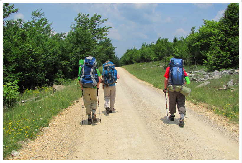 When we got to the Fisher Springs Run trailhead, the parking lot was overflowing with cars.  A couple people had decided to park sideways in the lot instead of straight-on, so they took up space that could have accommodated five or six more cars.  It was a little annoying and worrisome – would we get out to Rohrbaugh Cliffs and find all the prime campsites already occupied?  We ended up parking a short distance down Forest Road 75, in a patch of dirt just wide enough to get our car off the road.