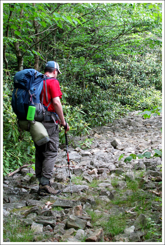 After lunch, we took a left onto the Rohrbaugh Plains trail.  The trail at this point was all rocks.  They almost looked fitted together like a jigsaw puzzle.  Almost immediately after the rocky patch, we dipped deeply into a ravine with a pretty flowing stream.  It was a perfect water source for backpacking. We figured that in the worst case scenario, we could hike back to this point to fetch water for cooking and cleaning at camp.