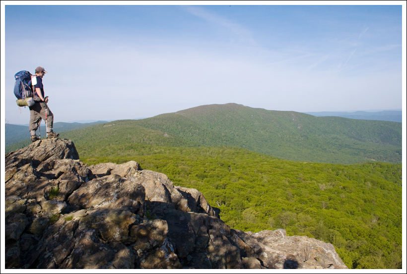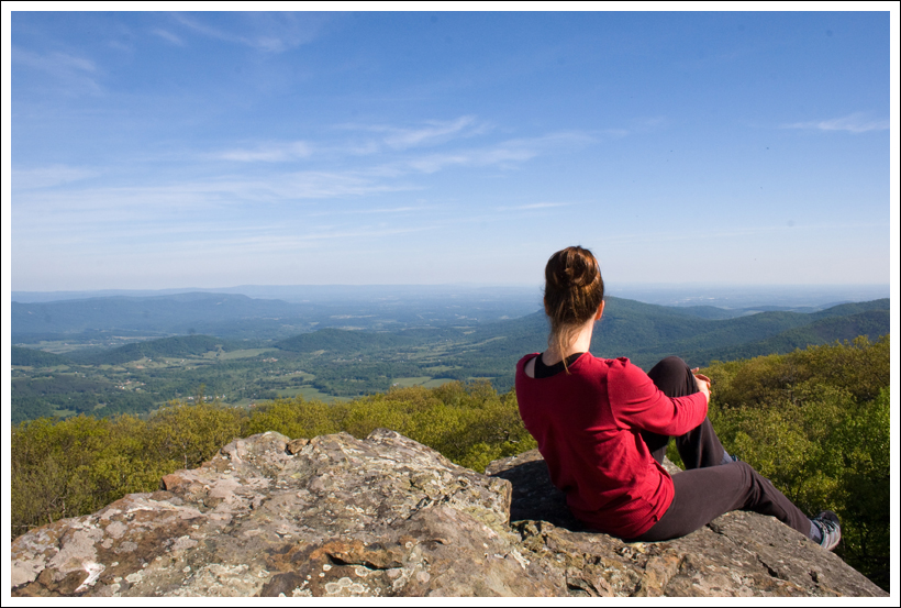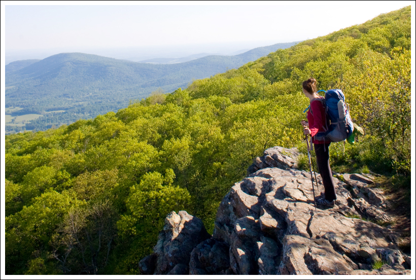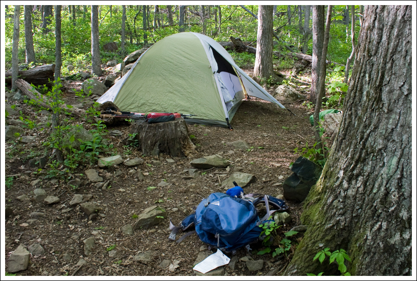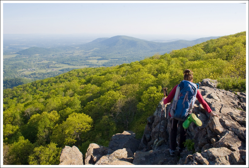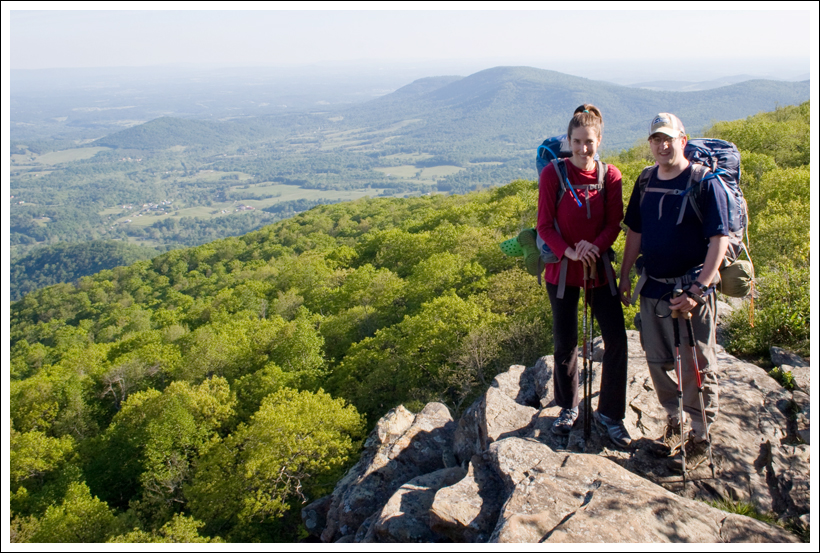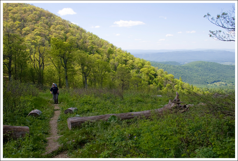 We finally started off on our hike around 1:30PM. We strapped on our 30 lb. packs on to our backs and started climbing up the hill. While we had been hearing the loud screams of the seventeen-year cicadas near our house, we were pleasantly surprised to hear they were not out in Shenandoah National Park. We stopped at a few points on the uphill climb to take in the views from Hogback Mountain. One nice thing about this hike is that the views were mostly on the uphill climbs, so it gives you a reason to take off your heavy pack and enjoy the scenery. A couple of thru-hikers we had seen at Elkwallow passed us near the hang glider launch. We’re always amazed at how fast they hike. I guess hiking every day has its pay-offs!