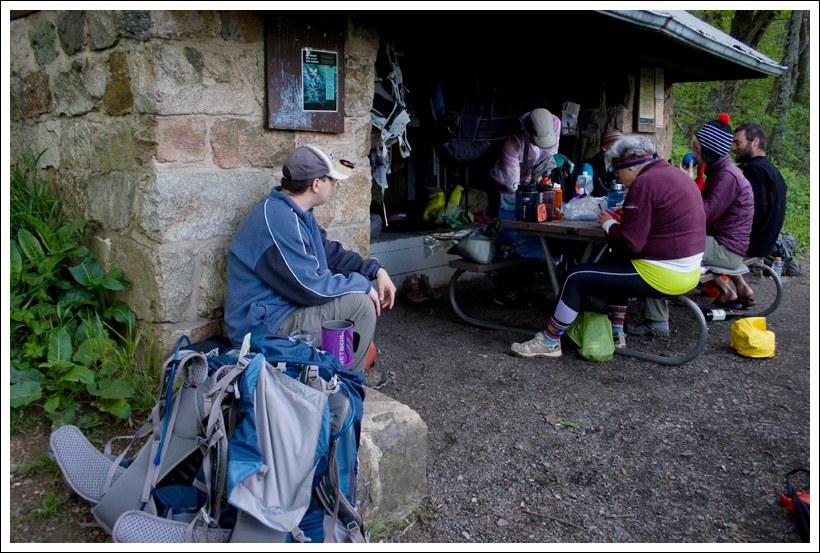 When we walked down to breakfast, our backpacks were pretty much fully loaded and ready to go for the day. The only things left to pack were our food, dishes, stove and water filter – and we always keep those items near the top of our packs. When we got down to the hut, almost everyone was already up and working on breakfast. We got our two bags (trash and food/other stuff that has a scent) down from the bear hang and joined the rest of the group at the picnic table. Breakfast was coffee and instant apple cinnamon oatmeal. You see a lot of oatmeal and granola at backpacker breakfasts. Clif bars and bagels are pretty popular too. Although, this particular morning, one pair of hikers even had a container of fresh berries!