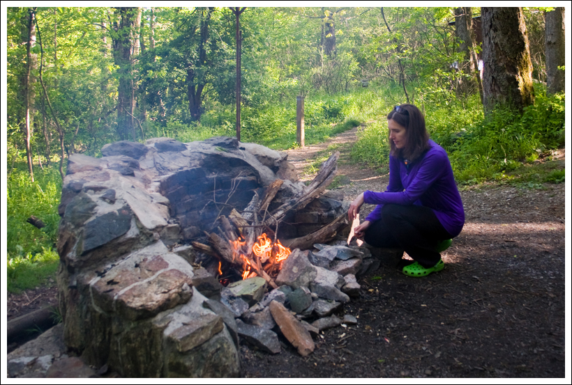We made our way down the mountain at this point. Backpacking uphill seems to be where you feel the weight the most, but going downhill has its own challenges – you feel the weight differently in your legs and have to be extra careful of your footing. We made it to the Gravel Springs Hut around 4:30PM and checked out the nearby area. There weren’t any other hikers there yet, so we were wondering if we were going to have this all to ourselves that night. We scouted out some of the campsites near the shelter. There were five campsites. We started to pitch our tent at the first campsite, but we realized we wouldn’t have enough of room to put up the fly. And with the night forecast to go into the upper 30’s, we definitely wanted the extra layer of insulation on our tent. We ending up moving to the largest of the sites, but this site was more sloped. We pitched our tent so that our feet were on the lowest, downhill part of the slope. We filtered some water and I began to work on cooking dinner while Christine gathered some kindling for a campfire. In most places in Shenandoah National Park, you can’t set fires in the backcountry, but this shelter had a large stone fireplace. We ate a dinner of Backpacker’s Pantry Sweet and Sour Chicken (which was delicious and definitely something we would have again) and Natural High’s Banana Cream Pie (which we didn’t like the taste or consistency).