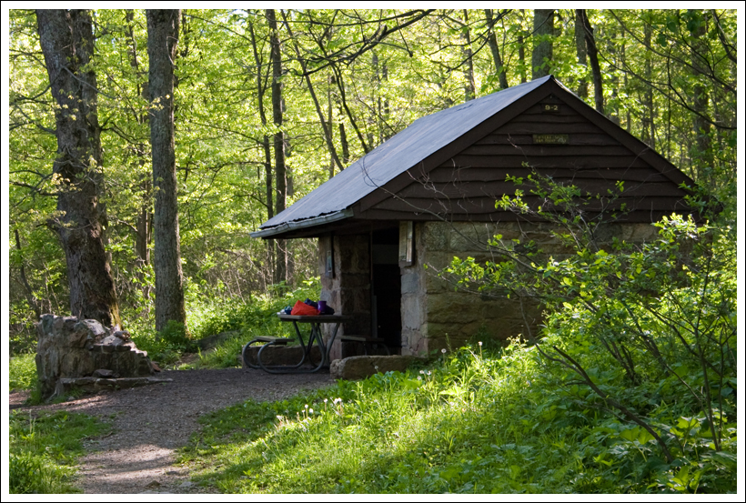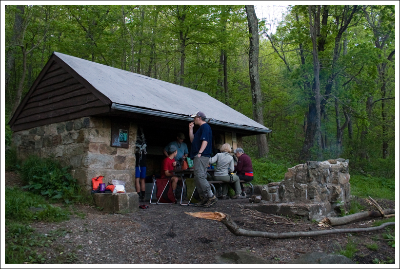 One of the highlights of staying at an AT shelter, is the people that you get to meet. Around 5:30, we met our first group of hikers that were planning on staying at the shelter. There was a gentleman named Don from Indiana, who had suffered a knee injury from hiking the AT previously, but was returning for a hike through Shenandoah to Harper’s Ferry to test his knee on an extended trip. He was accompanied by two brothers from Florida. The older brother, Adam had decided to introduce backpacking to his younger brother (who wasn’t enjoying it as much). The original plan was to hike the AT through SNP and return back. However, they had recently decided they would stop at Front Royal and then find a way back to Waynesboro that didn’t involve hiking. Next, two women came along and set up tents at two more of the campsites. They were out on a two night trip and had parked a car nearby so they could slackpack most of the trail. Shortly afterwards, Standing Bear arrived. Standing Bear was a thru-hiker that had started his trip from Georgia around the end of February. He told us a lot that night about how he has been attracting a lot of recent trail magic, from margaritas at a campsite to meals and lodging along the way. He told everyone that he was very good at ‘Yogi-ing‘. We then had another thru-hiker join us named Mountain Goat. When you looked at Mountain Goat’s legs, he just looked like a tough beast and he was working on trying to do over 25 miles a day to finish the trail quickly. As dusk approached, the last group of thru-hikers joined us – Rat Bucket and Sketch. They had purchased a couple of bottles of wine and were making their 6-mile trip from Elkwallow to the hut drinking wine instead of water. They were of course a little happier than most of the hikers when they arrived at the cabin. We hung out for a while, sitting around the campfire and talking about what areas the hikers had enjoyed the most (Grayson Highlands was the unanimous vote) along the way and food (which seems to be a constant discussion with thru-hikers).