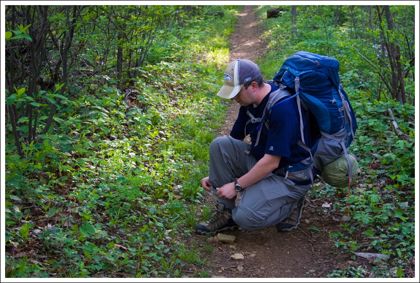 Adam and I are usually pretty efficient and can have our whole campsite broken down and backpacks repacked within about half an hour. The first step is always to shove our sleeping bags back into their stuff sacks. Then we repack our sheets, crunch down our pillows and let the air out of the sleeping pads. Once the bedding is stowed away, we pack up the tent and any clothing that was left strewn about the site. Yes… we really carry all this stuff! As you might have guess, we are not lightweight backpackers. We carry a lot of creature comforts and luxury items (pillows, sheets, chairs, books, card games, etc). When we go on longer trips, we’re really going to have to reevaluate our gear and make some sacrifices. 🙂