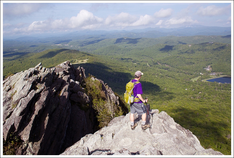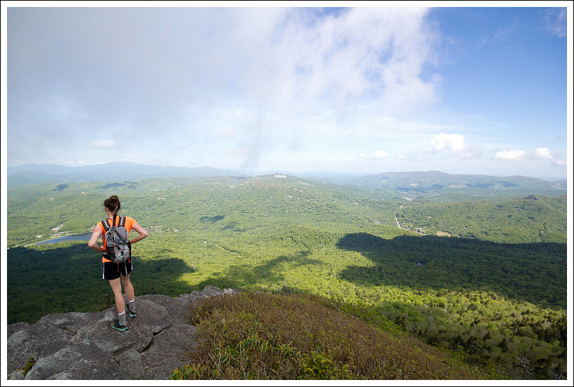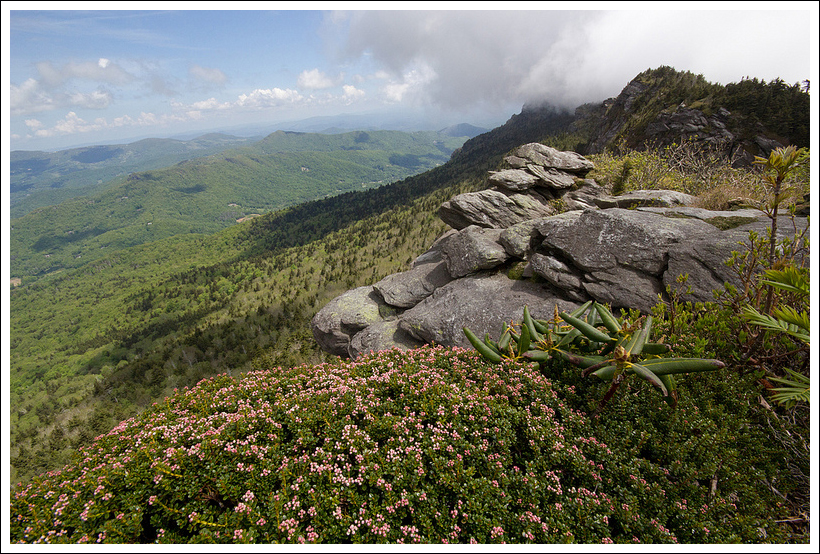 From Attic Window Peak, the hike offers some more moderate ridge walking with spectacular views all along the way. The rocky spine was covered with blooming sand myrtle, so it was especially pretty on this visit. In fact, when famed naturalist John Muir visited this mountain, he described this ridge as “the face of all Heaven come to earth.”  Luckily, John Muir got to visit this area before some idiot approved the Sugar Mountain construction project.  I swear, ‘The Sugar Cube‘ (the main building’s nickname) has to be one of the worst eyesores in Appalachian nature.  I guess its construction did inspire a change in legislation, so mistakes like that are less likely to happen again.