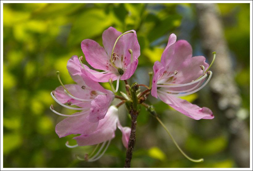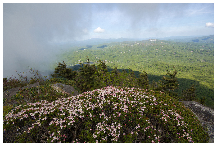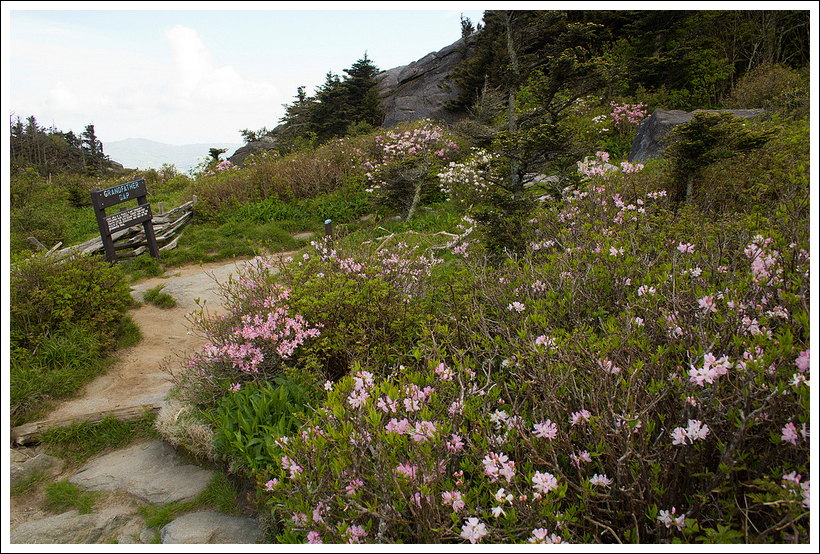 Sand Myrtle crowns Attic Window Peak on Grandfather Mountain, making the view all the more lovely. You can see the ‘Sugar Cube’ sitting on the mountain top off in the distance. Below: Hiker parking on Grandfather Mountain; A view looking back on the Mile High Swinging Bridge; Native pink azaleas.