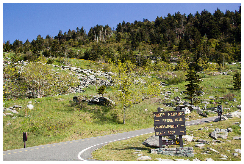 Directions to trailhead: The entrance to Grandfather Mountain is located on US 221, two miles north of Linville, North Carolina, and one mile south of the Blue Ridge Parkway at milepost 305.  Signs for the entrance are well-marked and an entrance station is right off the road with large gates.  Travel up the road by car until you reach the parking lot designated for hiking trails.  The trailhead for the Bridge Trail is on the left side of the parking lot as you are driving up. Coordinates for the hiker parking area are 36.096145, -81.831802.