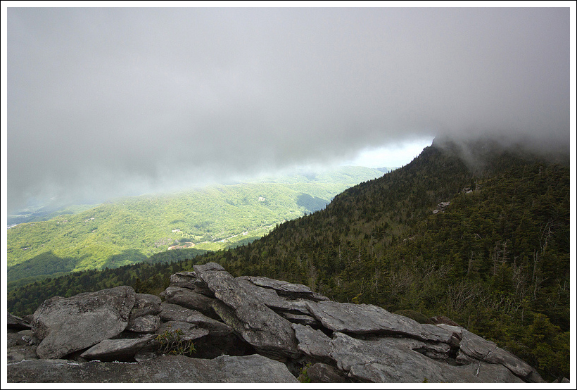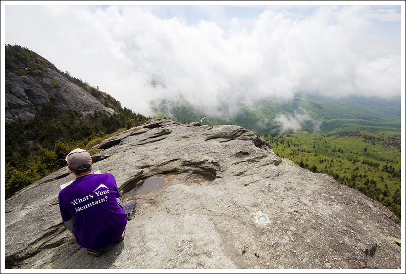 From the crest of the mountain, the trail descends again before beginning the final ascent toward Calloway Peak. The uphill hike passes through rich, mossy evergreen forest. On the way to Calloway, don’t miss taking a few minutes to walk out to the Watauga View. It’s a lovely rocky outcropping that looks into the Watuaga Valley. It was also the last place we had a view on our hike! On the way to Calloway, a massive cloud bank moved in and parked atop the mountain. It was like it was stuck and couldn’t quite make it over the peak. Watauga View was also the place I noticed that my smart phone had crashed at some point and wouldn’t restart (sorry – no MapMyHike stats). Normally, this would be a small annoyance, but just the night before my MacBook Pro self-destructed. Such technology angst!