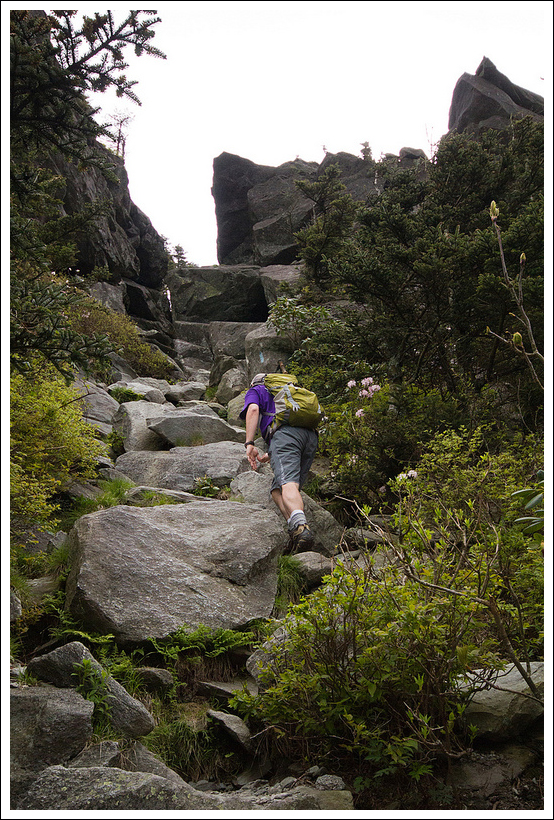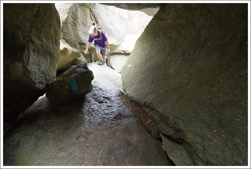 From MacRae, we descended steeply through a slick and rocky gap. The descent was short and ended at an immense rock jumble called ‘The Subway’. Ladders and blazes lead you through openings between giant boulders. On the other side, you soon face ‘The Chute’. The chute is a narrow, steep rock scramble that you must negotiate to reach Attic Window Peak.
