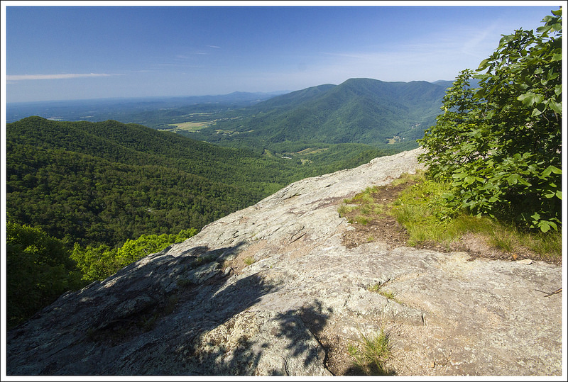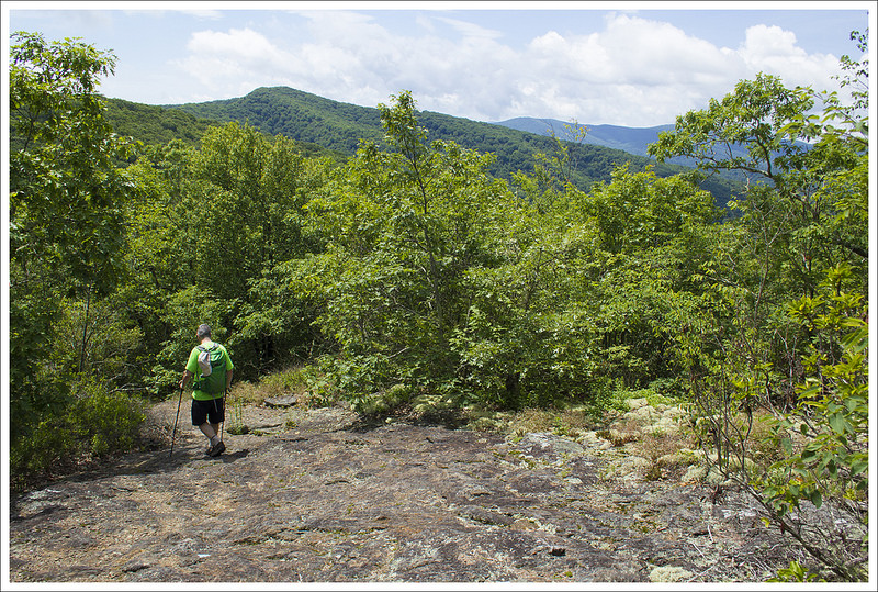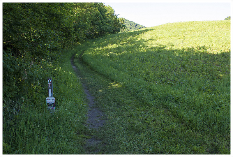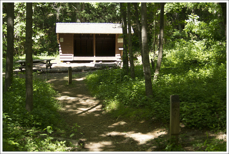 We signed the wilderness-area logbook and crossed the wooden footbridge over the Holston River. We immediately started a gentle climb uphill through the woods. Eventually we reached a gravel road that paralleled a farm field. We climbed over a stile into a livestock pasture. The cows were completely indifferent to us, grazing and swinging their tails to swat flies away. The trail climbed steadily across the open terrain. We had some nice views of mountains behind us, but the sun felt hot and strong. We were glad to get to the stile on the south end of the pasture and duck back into the shade. After leaving the pasture, we had almost four miles of non-stop climbing. It wasn’t terrible uphill, but it was steady. Kris and I took a detour and visited Trimpi Shelter about a mile into the climb. It was a cute shelter with a center aisle, indoor stone fireplace, and abundant flat space for tenting around the shelter. Even though it was only a bit after 2:00, there were already a few hikers stopped for the day.