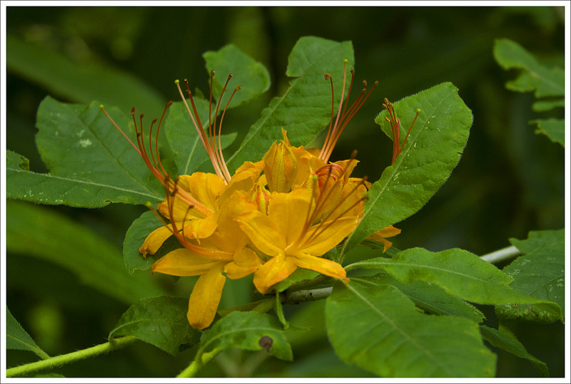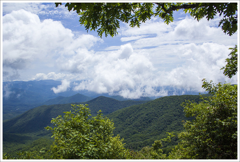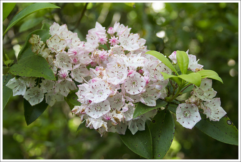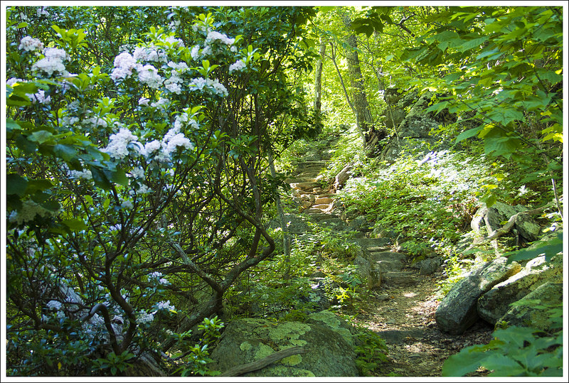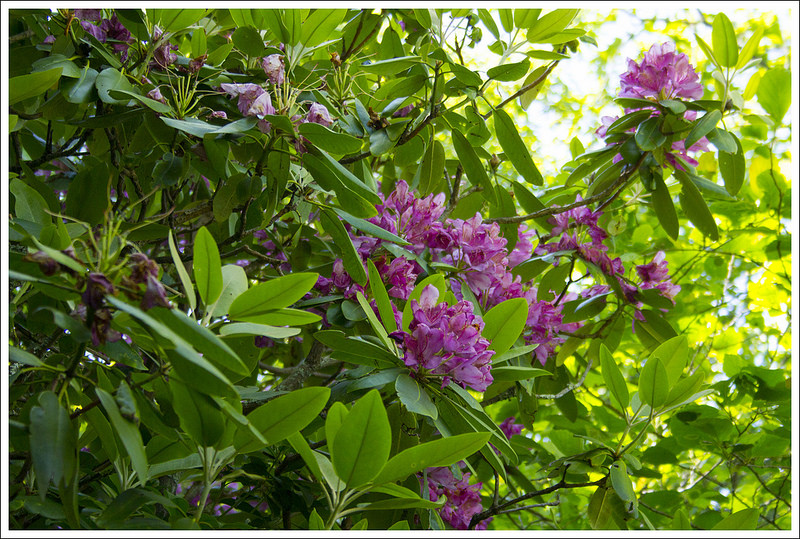 We climbed for another three miles. At the end of the ascent, we had a gorgeous, flat ridgewalk through lush fern. We trekked along until we reached the junction with a blue-blazed side trail that leads down to the forest service campground at Raccoon Branch. We stopped at the junction for a snack and gave Kris a chance to check on her feet. She was feeling a few hot spots in her new hiking boots and was dismayed to find several big blisters already forming just several miles into our hike! From there, we had a long meandering downhill to Dickey Gap. We passed lots of blooming flame azaleas and Catawba rhododendrons – and even a few early mountain laurels. We got to Dickey Gap a bit after 4:30. We chatted with a couple thru-hikers sitting in the shade under kiosk at the road crossing. They asked about the terrain headed north and indicated that they were going to try and make it to Marion (which was still 14 miles away!) You really have to admire thru-hikers’ ability to crush big miles like that.