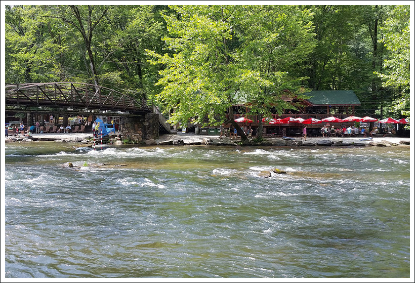 As we drew closer to town, there were billboards on the side of the trail advertising places to eat and drink in Damascus – they helped motivate us to finish. We ended up crossing US-58 on the outskirts of Damascus. The Appalachian Trail comes down a steep set of stairs on the right and rejoins the Creeper Trail again as it passes through town. We finished our hike walking alongside the road in the blazing sun. Kris had a near brush with danger as a kid on a bike carelessly ran her off the side of the trail. That was a real issue near the congested town section, since many bikers may not be as well-trained on etiquette or skilled enough to avoid others. We talked to another couple that had been hit twice by inexperienced cyclists on their run.