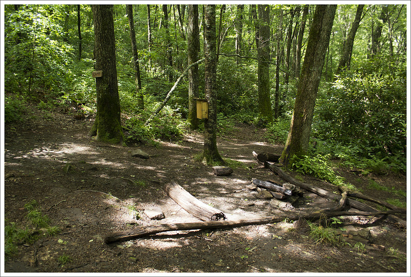 At 4 miles, we reached the Thomas Knob shelter. As I approached the shelter, I paused to take a photo and startled a retired police officer eating lunch there. Just a minute before I arrived, a bear had come right up to the shelter where she was sitting. She thought I was the returning bear. We stopped to eat lunch and heard more from the woman about the bear. The shelter log said that at night, gleaming bear eyes can be seen in the nearby trees, watching the open shelter.