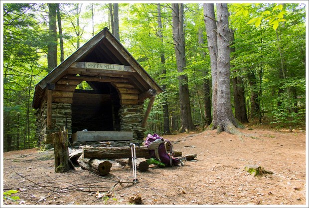 After Scales, we had a short but steep uphill to the top of Stone Mountain – the four mile mark for our day. The long, pleasant ridge-walk should have offered beautiful views, but we were still socked in by heavy clouds. It was cold and windy along the summit walk. After a gradual descent of Stone Mountain, we entered Little Wilson Creek Wilderness. It was lovely and green. At 6.2 miles, we reached Big Wilson Creek and the junction with the horse trail. We crossed the stream on a wooden footbridge and went over another stile. I was paying close attention to my footing as I crossed a rocky area. Adam looked back at me from ahead and nonchalantly said, “Hey… I’m going to stop here and take photos of some ponies.” PONIES! I thought he was kidding at first. I didn’t expect to see ponies until day four. But sure enough… there was a band of six ponies grazing in marshland along the trail. Adam stepped slightly off trail to get a better view when suddenly a tiny black foal popped out of the deep grass. He couldn’t have been more than a week old and he was beautiful! The three of us all greatly enjoyed spending time watching these wonderful animals. The ponies eventually wandered deeper into the marsh, and we continued another .2 mile to Wise Shelter – our lunch stop for the day.