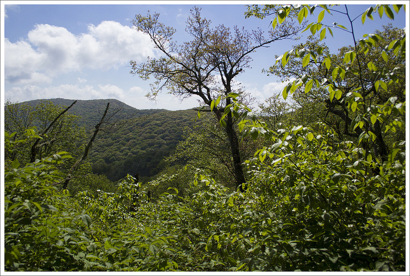 We set out on this hike on a particularly hot and humid late April morning. We parked at Brown Gap (near mile marker 83 on Skyline Drive). From there, we crossed the road and followed the Appalachian Trail south. The first three tenths of a mile ascend gently uphill before reaching a mostly flat ridgeline. Everything in the park was bright, spring green and the native pink azaleas were just starting to bloom. At .7 miles, we passed the Dundo Group Campground. The campground has water and restrooms (seasonally).