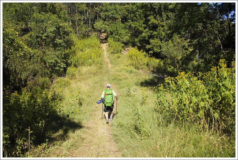 After leaving McAfee, you descend through a maze of boulders. There are many interesting rock formations on this section. Below: An eastern fence lizard; Campbell Shelter; The weeds were hip to shoulder high along the trail; A nice shady spot to rest; We got one distant look at the reservoir on the first day; After descending into this grassy area, you begin the tough climb to Tinker Cliffs.