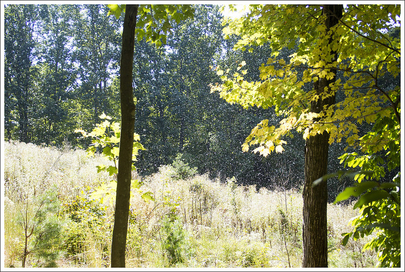 A beautiful view of the Carvins Cove Reservoir. Below: A lot of day two was unshaded; We passed through a meadow with seed pods flying everywhere in the breeze – it was like being in a snowglobe; The descent was welcome as the day got hotter; We crossed railroad tracks; A pretty section of pines; We met this blacksnake.
