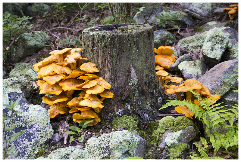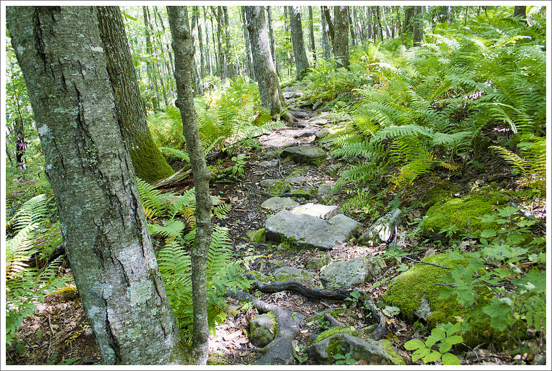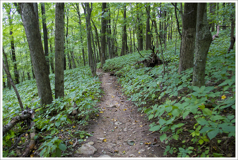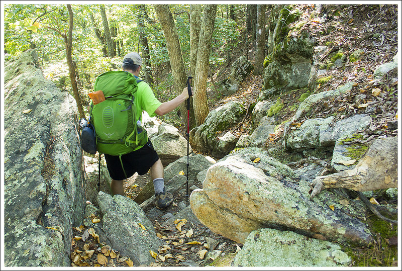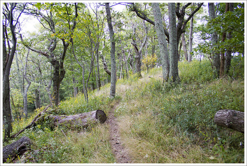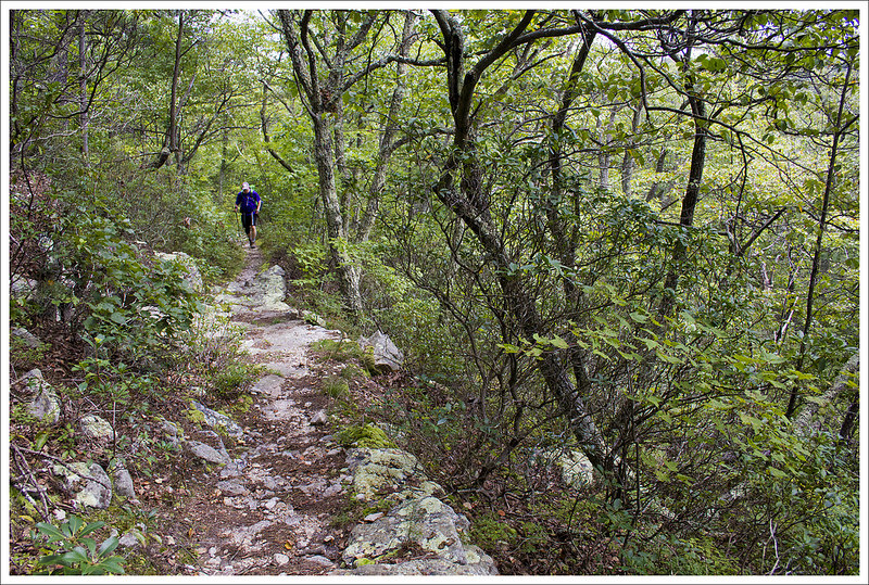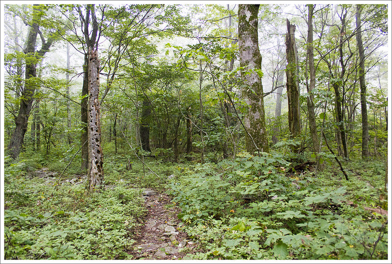 We picked this area because it’s less visited than most other parts of the park, and we had never done this particular loop before. The trail was relatively easy until we passed the junction with the Lewis Mountain Trail. From there until we reached the Big Run basin, the trail was extremely rocky and overgrown. Parts of the trail are not really even trail – it’s just blazes and talus slopes.