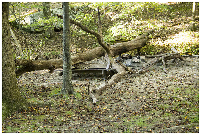 In .3 miles, we came across the Lamberts Meadow Campsite, which also had no water in the stream next to the campsite. We saw the fallen tree that had smashed through the picnic table. Homer had told us that if that picnic table hadn’t been there, it would have likely fallen directly on the tent. He was planning in another week to build and bring another table down there to replace the one that had been smashed. Since there isn’t great access to this area except for a long hike, I can’t imagine hauling a big table through the woods like this, especially at Homer’s age (in his 70’s). Homer is the true definition of a trail angel and has helped so many AT thru-hikers and others along the way.