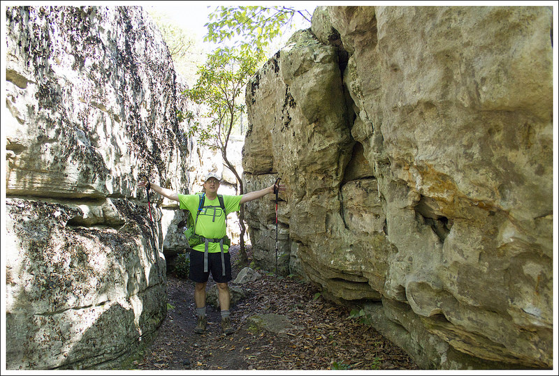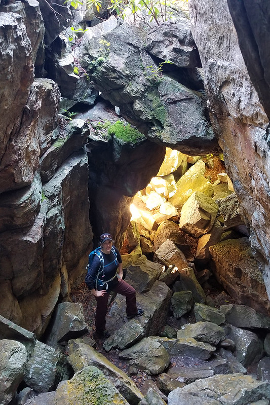 Continue on the trail past the campsite and at 3.4 miles you come to some stone steps that lead to the area known as Pete’s Cave. The rocks in this area remind me of rows of shark teeth that probably need to go to a dentist. This is an interesting area to explore, but please know your limits! This is a dangerous area with cracks and holes you could fall into or get an ankle stuck or hurt. We crawled through one area that had a cave-like feel to it, but there was a skylight that let some light in so you didn’t feel too claustrophobic. At the top of this “cave”, there was one area where I was able to scramble up to the top of a large boulder and got some incredible views to the west, but getting back down was a bit more sketchy. Again, be careful in this area if you choose to explore.