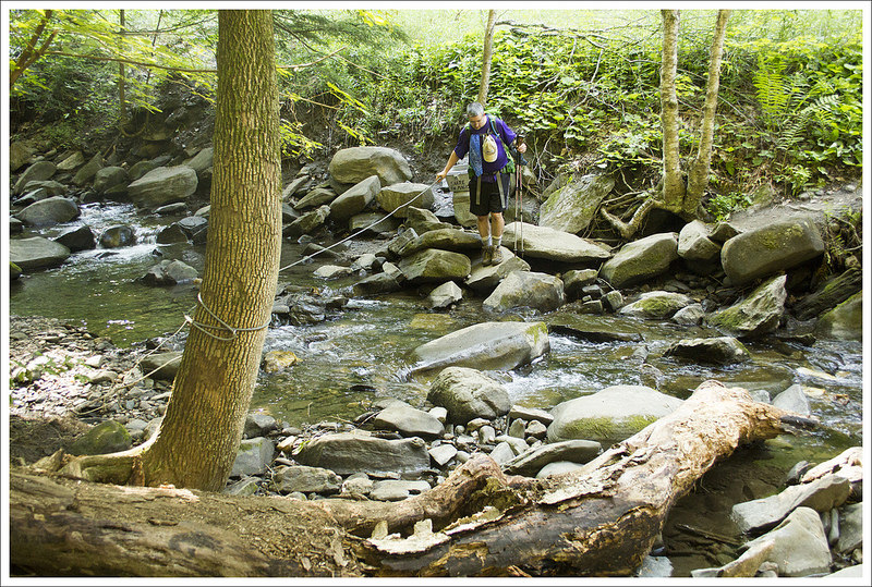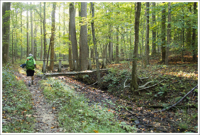 We had a good night of sleep and got up early to get breakfast started and continue our hike for the day. Rejoining the main Big Run Portal trail, we soon passed another large campsite to the right of the trail. The trail started off fairly flat as we were walking along the Big Run area. One difficult aspect about this section of the trail are all the water crossings.