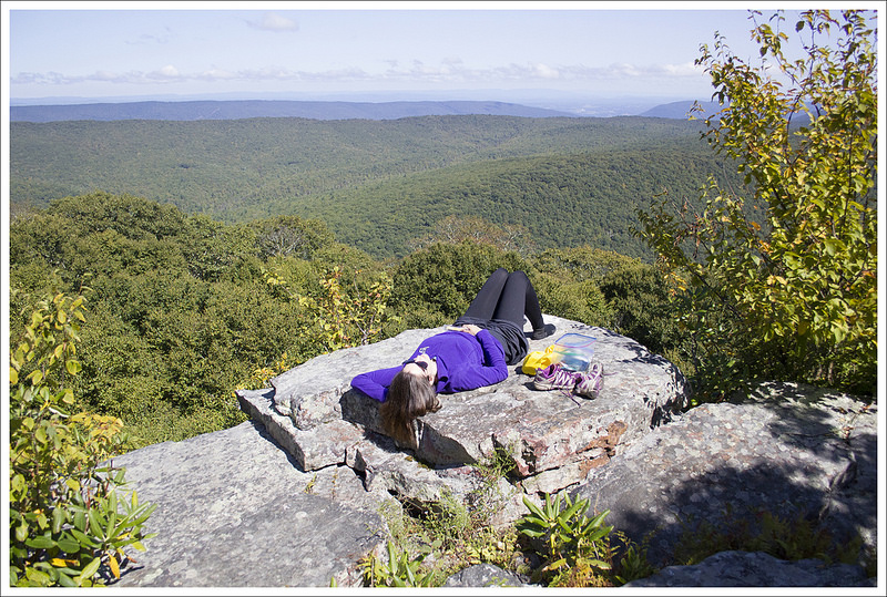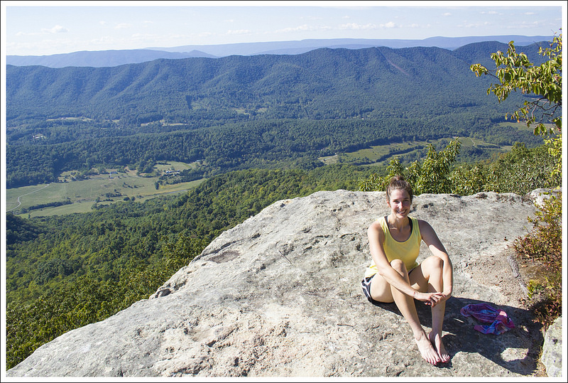 Navigating the trail as it heads up Tinker Cliffs is a bit tricky. Look carefully for white blazes and arrows. There will be openings in the rocks that look like trail, but they’re not. Most of these openings are blocked by branches dragged across the ground, but if you’re not paying attention you might head the wrong way. When we finally made it to the top of the cliffs, the views made all the effort worthwhile. We had the entire overlook all to ourselves! I thought the views from Tinker Cliffs were even better than McAfee Knob. I took off my shoes and socks and let myself bake for a few minutes in the late afternoon sun. It was probably still in the low 90s – such a hot day for late September!