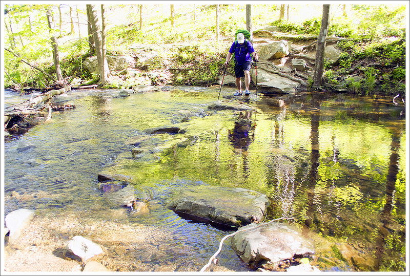 Our second day started with a very frigid morning. None of us wanted to get out of our tents, preferring to stay warm and snug in our down sleeping bags. But, we had a ten mile hike to our next camp stop and wanted to get an early start. After coffee and two packets of oatmeal each, we packed up and headed out of camp. In .7 of a mile, we reached the rocky outcropping known as Raven Rock Cliff. The view was partially obstructed, but offered a nice peek at expansive farmland in the distance. From there, the trail descended through a boulder jumble to Raven Rock Road and Little Antietam Creek. The logbook at the last shelter had indicated that the creek had been hip-high rapids the day before, so we were exceedingly relieved to find the water level had come back down to an ankle deep rock-hop. A lot of the stepping stones were underwater, so we all took a minute to change into our Crocs for the crossing. After crossing, we climbed up and down a steep knob in the terrain. This is a common feature of the Appalachian Trail called a ‘PUD’ or a pointless up and down. Basically, something steep that seems to serve no purpose and offers no scenery. At two miles into our hike we reached Warner Hollow, where we crossed another small stream. This one had a double plank laid across the water as a bridge. The boards were halfway submerged, but still offered enough footing to cross without having to take our shoes off again.