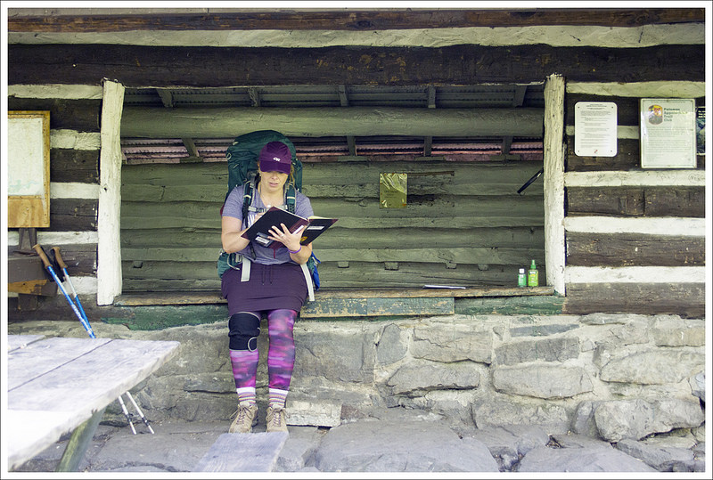 Raven Rocks Shelter and its nearby campsites are beautiful and spacious. Below: Pinxter azaleas were abundant along the trail; Fly Girl (Kris) reads and signs the shelter log; It was a cold night, so we all enjoyed the campfire.