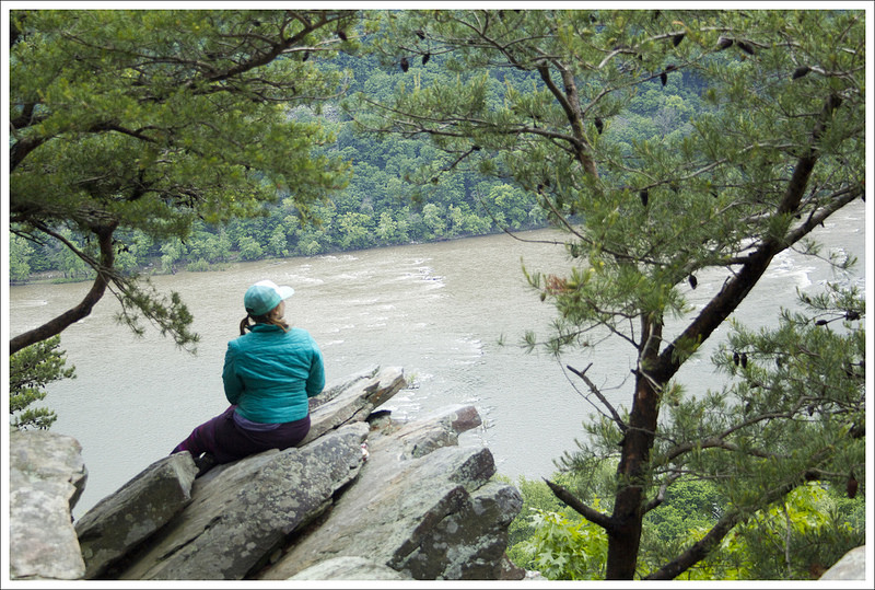 The trail was fairly flat for most of the day. We reached Brownsville Gap at 1.9 miles and then continued on a flat, but gorgeous green trail through the woods until we came to the Ed Garvey Shelter at 3.7 miles. We ran into a pair of siblings that were the last to leave the shelter and we asked about the other groups we had met on our section. Almost everyone had stayed there the previous night, but it sounded like everybody hunkered down grimly in their tents and had a rough night. They told us that one family we had met, the parents had bailed out and called for a ride into Harpers Ferry while the sons continued on (they were thinking about hiking parts of the AT in sections as a family). I guess everyone’s spirits were beaten down from the weather, which made us feel guilty for a brief second that we had made the call to get to the hostel and enjoy showers and hot food. The Ed Garvey shelter is a two-story shelter that had an AT symbol formed out of the railings in the loft looking down from the top story. We signed the log, ate a quick snack and then continued. A short time away, we ran into Medicine Man, one of the AT thru-hikers that stayed with us at Teahorse Hostel and had started early to go northbound for the day. Medicine Man was a retired pharmacist (fitting trail name) and one of the most genuine, friendly people you will meet. We wished him luck for the remainder of his hike and continued on. At 5.8 miles, we had caught up to the siblings at the junction with the side trail to Weverton Cliffs. The side trail led down a couple of tenths of a mile down to a large outcropping that overlooks the Potomac River. We could soon hear the sounds of a train going by below us. While the day was hazy and a bit cloudy, we enjoyed watching the river flow below us. This was the last of our scenic views, so we stayed here a while to capture some memories and reflect on all we had done so far.