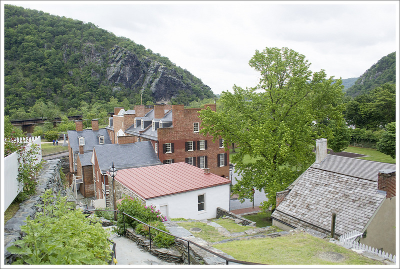 Enjoying the view of the Potomac. Below: Walking the C&O Towpath; Crossing the pedestrian bridge into old town Harpers Ferry; A view of all the historical buildings.