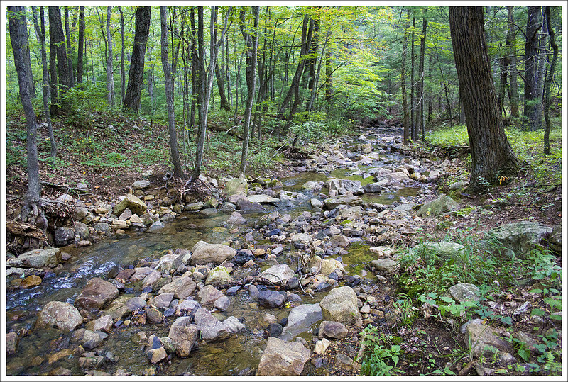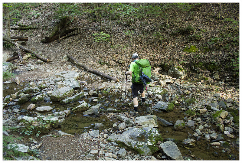 There were several water crossings that made it difficult to follow since it wasn’t very clear where the blazes were on the other side. In fact, on one stream crossing, we missed a blaze on the left on an “island” about halfway across the stream. Our map did not indicate the partial stream crossing. We went past this and fully crossed the stream, only to find no blazes. We bushwhacked and scouted around for about 20 minutes before going back across and then we saw the not-so-obvious blaze that we had missed the first time. This trail is really not a very popular trail, so foot traffic doesn’t create as obvious of a trail as you would see in more popular sections of the park. A few more trail blazes would definitely help navigate this Big Run Portal Trail.
