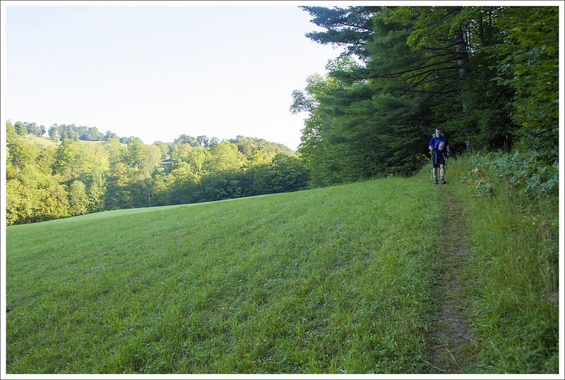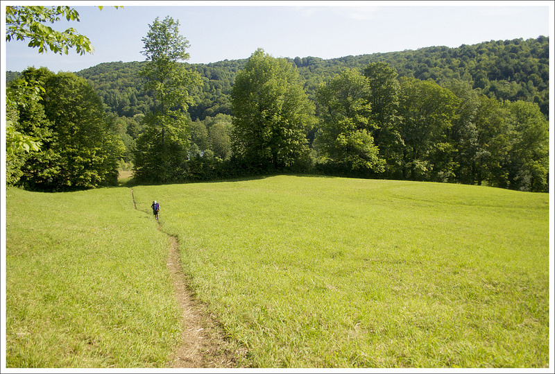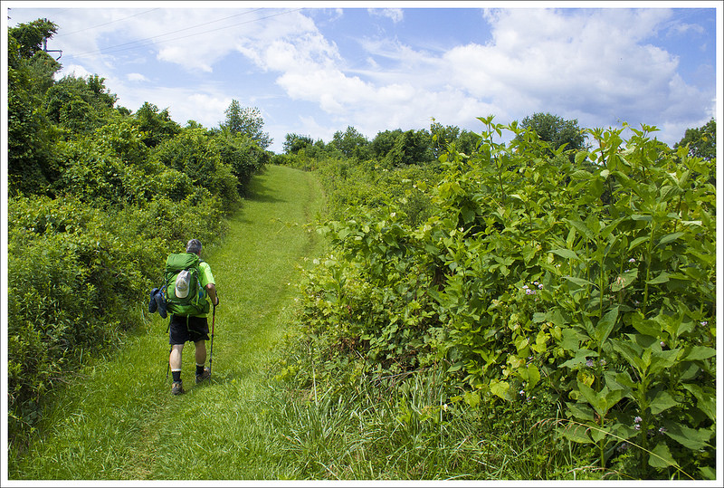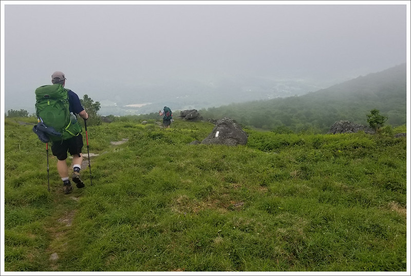 The view from Tinker Cliffs was as nice as McAfee. Below: On the climb up you get a nice meadow view; The trail is a little tricky so pay attention to signage and look for logs blocking the wrong way; It was still around 90 degrees when we got to the top of Tinker (notice the beet red face); Adam walks along the cliffside; Descending beneath Tinker Cliffs; the final mile into camp was easy terrain.