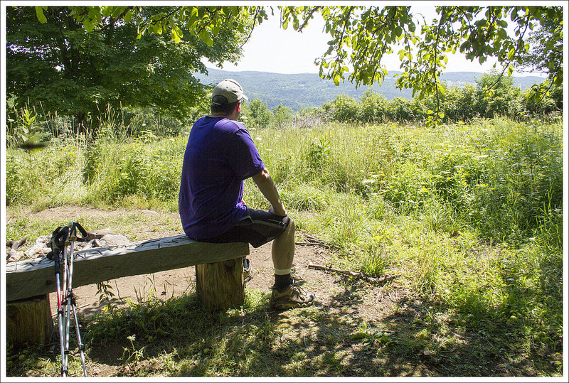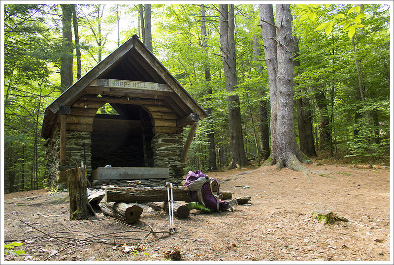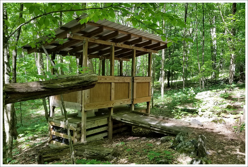 After leaving the viewpoint, you’ll descend steeply into a maze of giant boulders. There are narrow openings in the maze, making it a fun place to explore. A half mile later, there is an open meadow under powerlines and a nice view of the distant mountains. The descent continues for about 1.2 miles. At the bottom, you’ll reach the Pig Farm Campsite and shortly after that – Campbell Shelter. The shelter is on an elevated platform and there is a privy, picnic table, and bear locker at the site. The water source, located about 150 yards to the left of the shelter, was also dry!