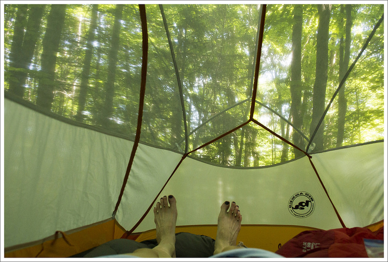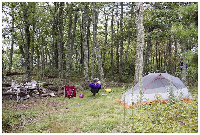 We were both pretty tired of rocky footing by the time we got to the old road bed of the Big Run Portal. After crossing the metal bridge over Big Run, we explored an unmarked footpath paralleling the stream and found excellent campsites. The sites were clear and flat, and nicely distanced from the stream (backcountry regulations for Shenandoah dictate that you must be 10 yards from a stream.)
