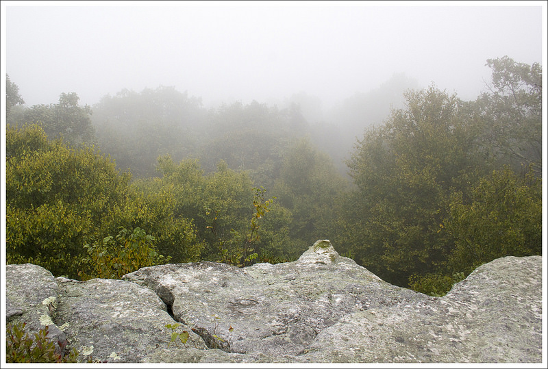 After passing the spur trail to the shelter, we had another 1.4 mile climb up to Lambs Knoll. We crossed the paved Lambs Knoll Road and ascended the mountain. We saw a small sign indicating a side trail to visit a view tower. We were in dense fog and pouring rain, so we made a collective ‘nope!’ to visiting the view. Another .2 miles past the tower, there was another view at White Rock Cliff. It was all fog and rain, so we kept moving along the trail. It’s amazing how fast you can hike when it’s cold and wet and there’s nothing to see! After White Rock Cliff, we had a gradual 3.2 mile descent to Crampton Gap Shelter. The descent followed a rocky ridgeline. It would probably have been beautiful on a nicer day. Kris and Adam were moving a bit slower due to the slippery footing. I wanted to go faster to stay warmer, so I pressed ahead. Being cold and wet is one of my outdoor fears (just behind Lyme Disease), so I was doing everything I could to keep my blood pumping. At the spur to Crampton Gap Shelter, we discussed altering our plans for the day. Our goal was to make it to Ed Garvey Shelter (4.1 miles ahead on the trail). It was only 9:45 in the morning, so we knew we’d be there by lunch. We also discussed whether or not we really wanted to spend all day holed up in our tents or the shelter. The alternative would have been a long, cold, miserable, viewless 18 mile day into Harpers Ferry. We agreed to give the matter some thought and re-discuss it when we reached the picnic shelter at Gathland State Park.