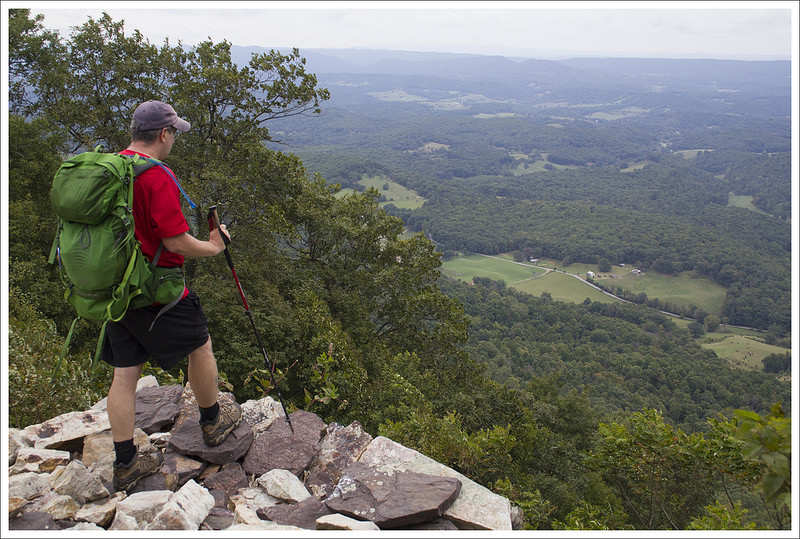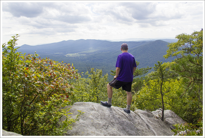 In another mile, we passed the Catawba Mountain Shelter. It’s a similar set-up to Johns Spring in terms of space. There are also several nice campsites with metal fire pits just north of this shelter. After passing this shelter, there is a steady 1.7 mile climb to the view at McAfee Knob. On the way to the top, you’ll cross a fire road. Stay on the white-blazed Appalachian Trail. Near the top, you’ll pass through an impressive jumble of truck to cabin sized boulders. The overlook is a couple hundred feet to the left of the trail and is marked by a small sign.