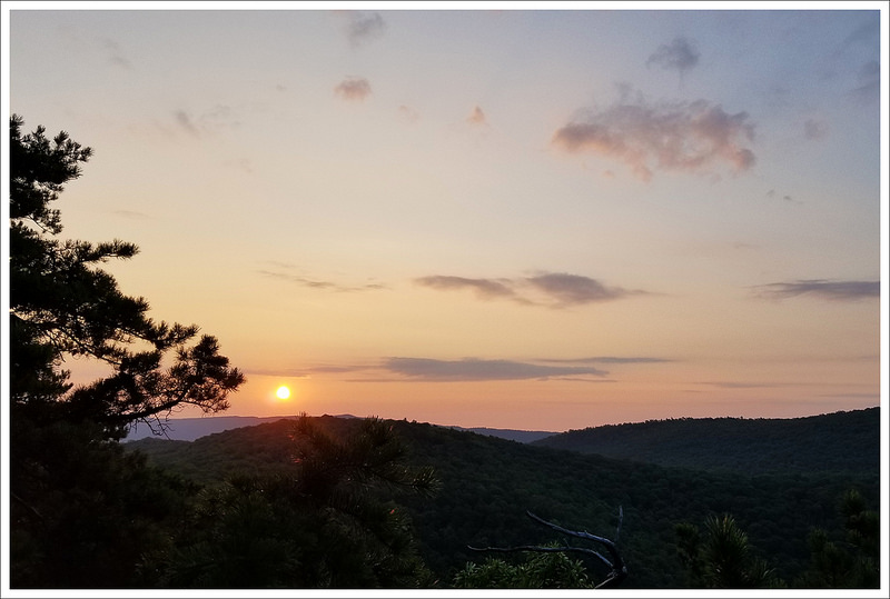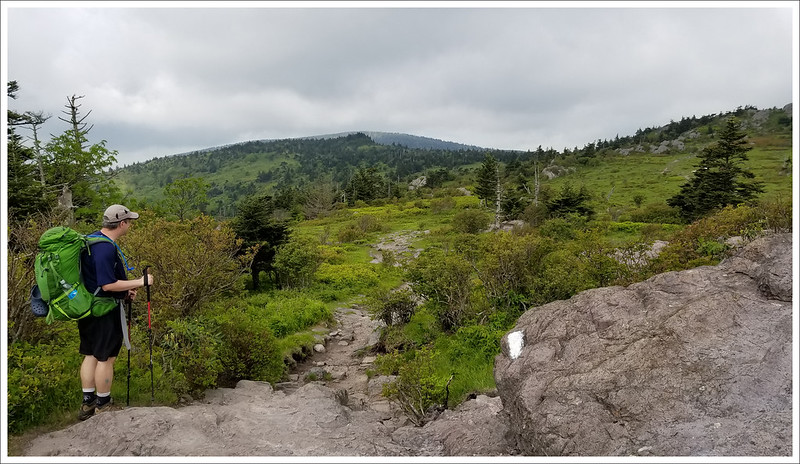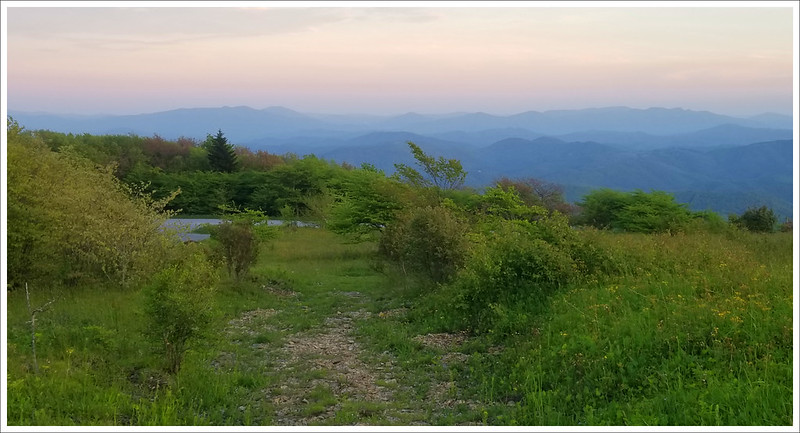 We got up with the sunrise, and hiked up to Duncan Knob without packs. It’s just a short few tenths of a mile to the rock scramble, so it was nice to leave everything behind and hike up empty-handed. As many of our regular readers know, I have chronic vertigo and don’t do well with rock scrambles. I can do them if I must, but it’s pretty scary and disorienting. I climbed about halfway up Duncan Knob’s scramble and found a nice flat rock that was high enough to provide an open view. Adam continued to the top of the knob on his own.