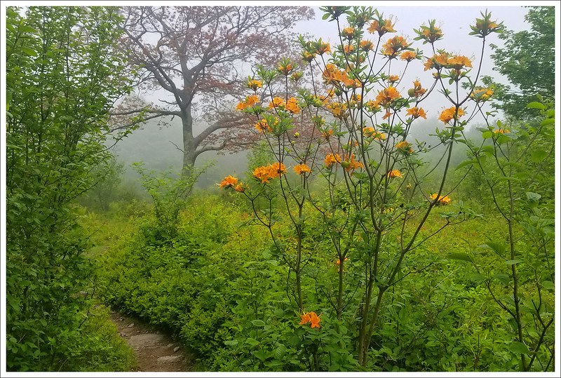 After enjoying the morning view, we headed back to our campsite at Peach Orchard Gap. We ate breakfast and broke down camp. The hiking on day two was mostly downhill or flat(ish). There were more muddy, swampy spots along the Scothorn Gap trail, but generally it was easy walking. There were plenty of native pink azaleas along the trail, and a few mountain laurels starting to get buds. Wild geraniums and spiderwort were also abundant.