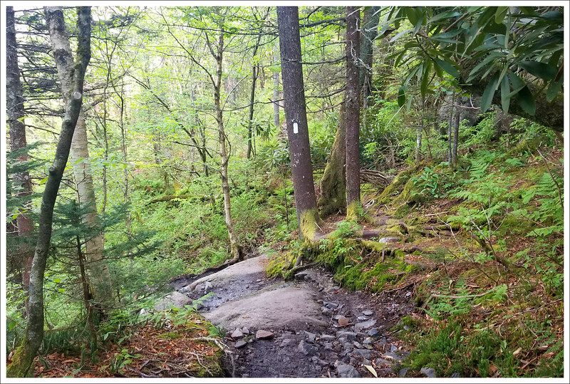 Follow the trail straight onto the blue-blazed Rockytop Trail