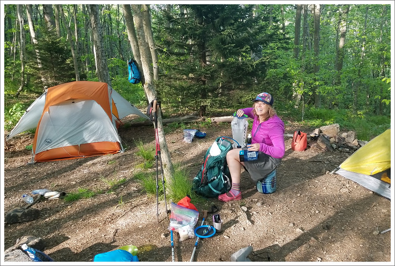 We got the tent set up and changed into camp clothes. It took us a full hour to filter four liters of water! First, we had to scoop water into our bucket. It was full of mud, pebbles, mosquito larvae, and algae, so we had to filter that water through a bandanna into our Sawyer bags. The we squeezed the water through the Sawyer into our Camelbaks. It was the color of weak tea, so I chose to treat it with Aquamira on top of the filtering. It was nasty!