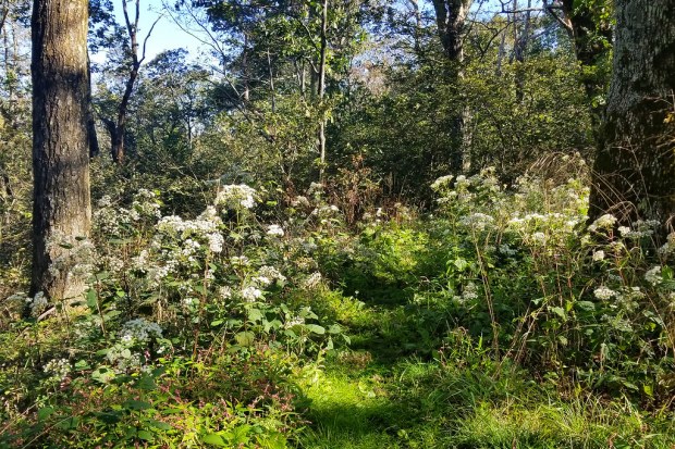 Look for the cement post marking the blue-blazed Big Run Trail, turn left.