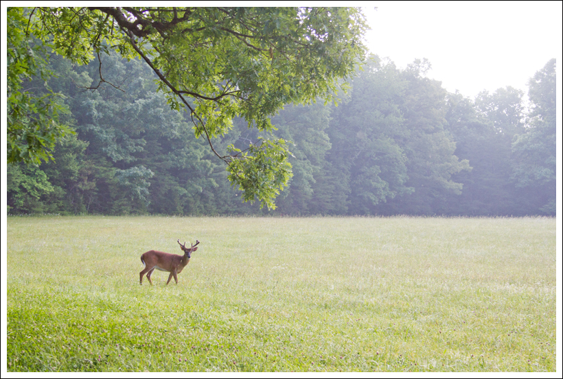 This solo buck enjoyed grazing in a misty meadow. Below: Some of the downhills are steep and curvy, so warnings are posted; Old cabins are abundant in the cove.