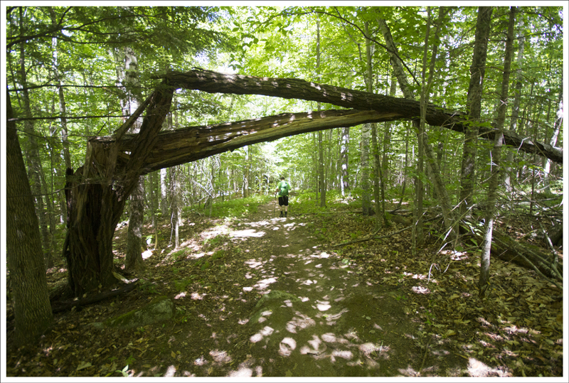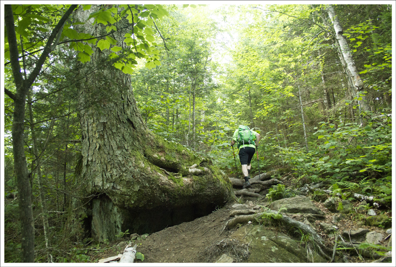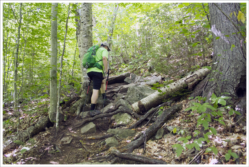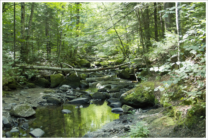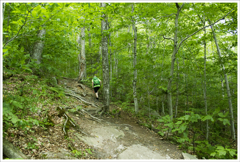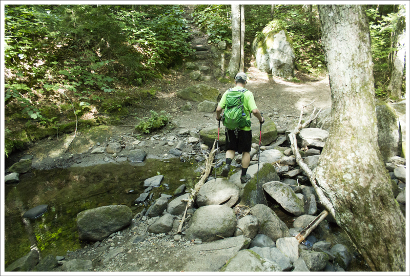The first mile and a half of hiking was beautiful and easy. We climbed gently uphill and passed through a mixed hardwood and pine forest. The overhead canopy kept the trail shady and cool, even on this rather warm summer day. Our guidebook marked a stream about 3/4ths of a mile into the hike. When we got there, we found a southbound section hiker filtering what amounted to a mud puddle. He was worried about running out of water and didn’t want to pass any source without gathering what little he could. Last summer, New Hampshire experienced serious drought conditions. Many streams that normally flow year-round were reduced to a trickle, so I understood his concern.