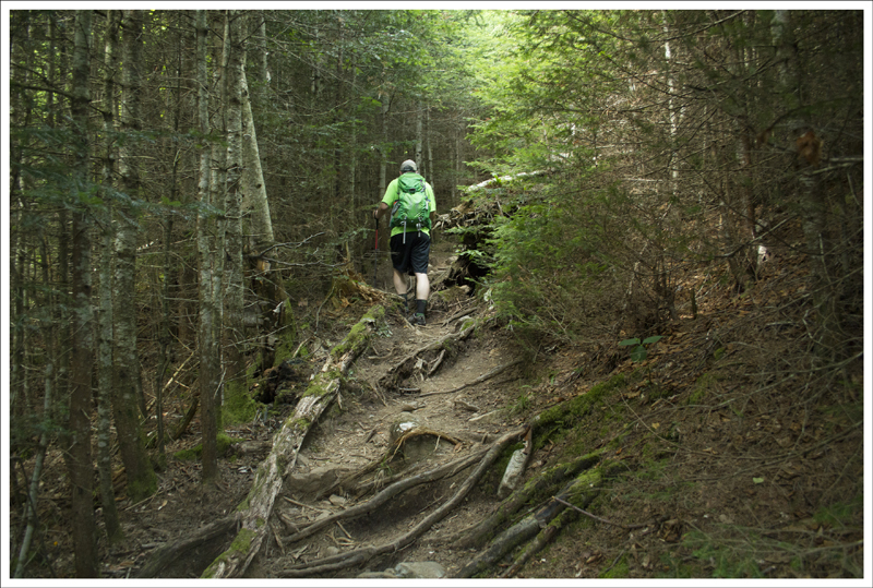 We reached the second stream marked in our guide, Brackett Brook, and found it was still flowing with clear, clean water. Side note: I love how New England has brooks and notches instead of creeks and gaps. As a southerner, they just sound more exotic and picturesque. After crossing the brook, the climb became a bit steeper, but remained uncharacteristically smooth and uncomplicated. We stopped to chat briefly with another thru-hiker. I said something to him about how nice the terrain had been along this stretch of trail and he just replied ‘Ugh‘ and shook his head. I thought to myself, ‘Hmmm… maybe there’s something I don’t know?’