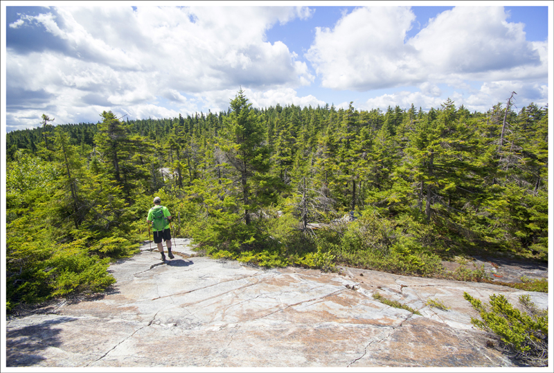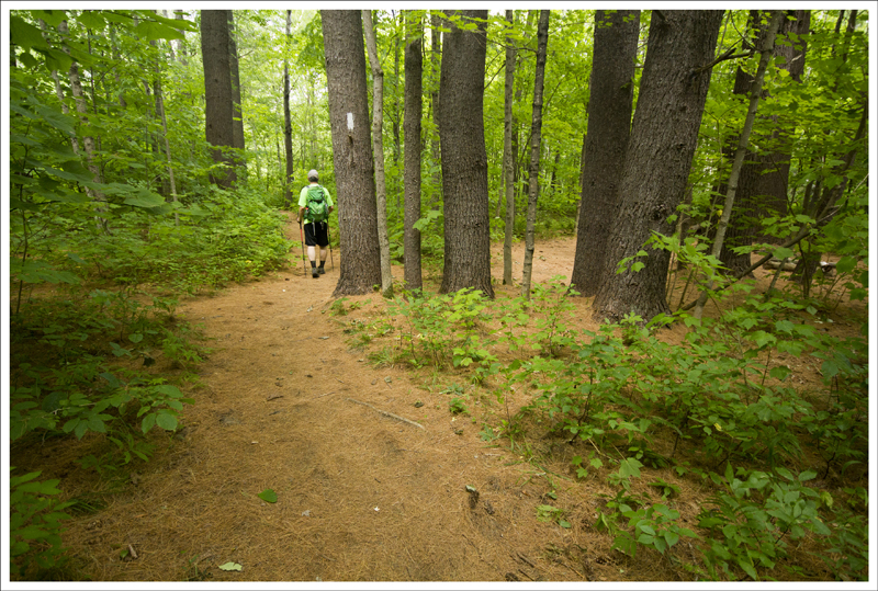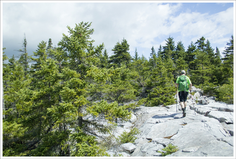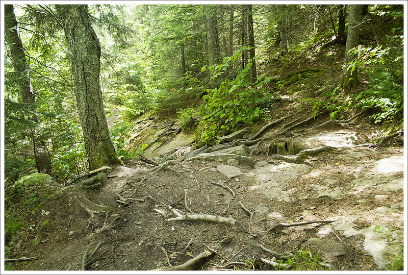 Soon after that, the trail went from mostly dirt tread to a steep mix of roots, rocks, and log steps built into the earth. It still was pleasant terrain compared to most of what you see in the Whites, but I get the origin of the thru-hiker’s Ugh! Near the summit, the trail leveled out through a stretch of hemlocks and pines. The footing was a mix of fallen needles and granite sand.