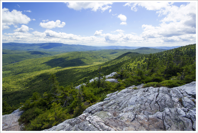 It was a tough slog for the next 1.5 miles of switchbacks up the mountain, but at 3.3 miles the climb levels and we reached a sign at an intersection. We took a right to check out the northeast summit of Mount Cube first. The trail is a little tough to follow to the summit. Follow the sparse blazes through the woods and the trail opens up to above treeline. Walking on the rocky surfaces made it hard to find the proper path, but we would pick up a blaze eventually and knew we were on the right path. At 3.55 miles (just .25 miles from the junction), we reached the northeast summit. The views were phenomenal and we found ourselves surrounded by wild blueberries on the shrubs around us, which made for a snack among the majestic views. We spent a long time on the rocky ledges overlooking the valley, with views of Mt. Moosilauke in the far distance.
