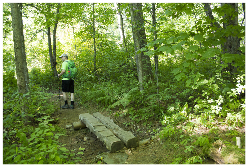 We were both pretty tired of rocky footing by the time we got to the old road bed of the Big Run Portal. After crossing the metal bridge over Big Run, we explored an unmarked footpath paralleling the stream and found excellent campsites. The sites were clear and flat, and nicely distanced from the stream (backcountry regulations for Shenandoah dictate that you must be 10 yards from a stream.)
