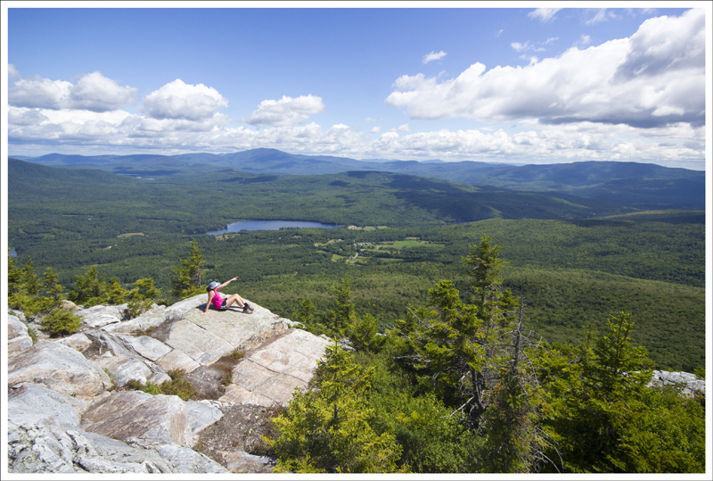 At the top, we decided to check out the north summit first. To get to the north summit, you follow a spur trail that departs the AT. It was gorgeous – ledges and blueberries and views for miles and miles! Upper Baker Pond added a lovely water feature to the vista. The pond is home to vacation cottages and a summer camp called Camp Moosilauke. We spent lots of time enjoying the solitude, taking photos, and eating our lunch. Eventually we made our way back to the junction and followed the trail a few tenths of a mile to the south summit.